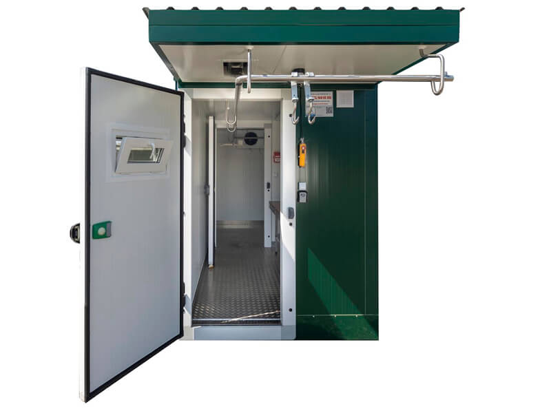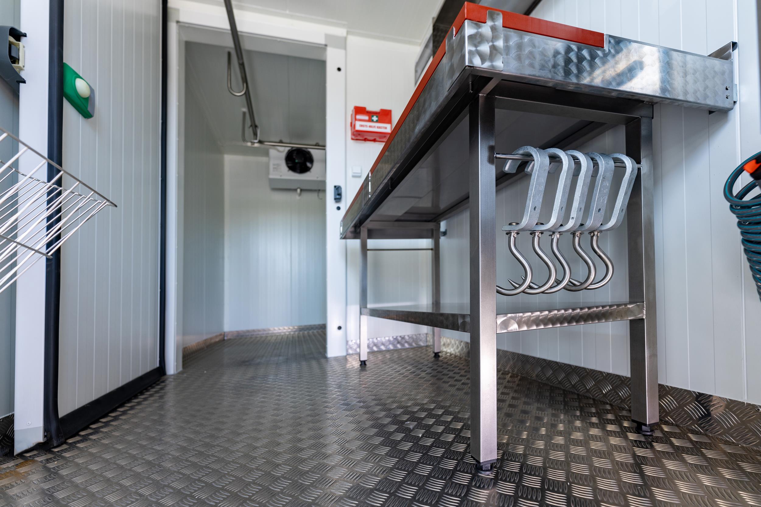 Cooling room – a space for cooling and storing wild game. Thanks to the premium Embraco Aspera cooling unit, 10 cm-thick walls, and special cooling doors, a minimum cooling temperature of up to -5°C can be set (regardless of the outdoor temperature).