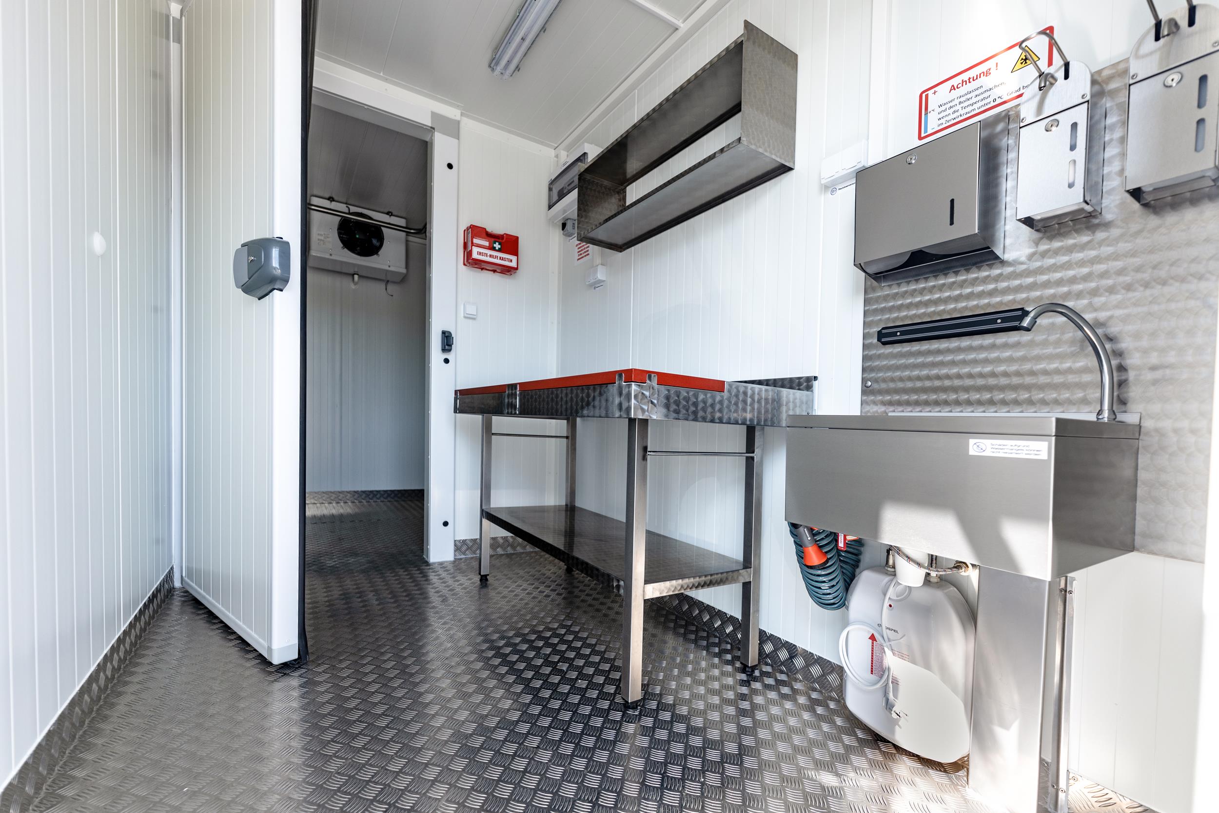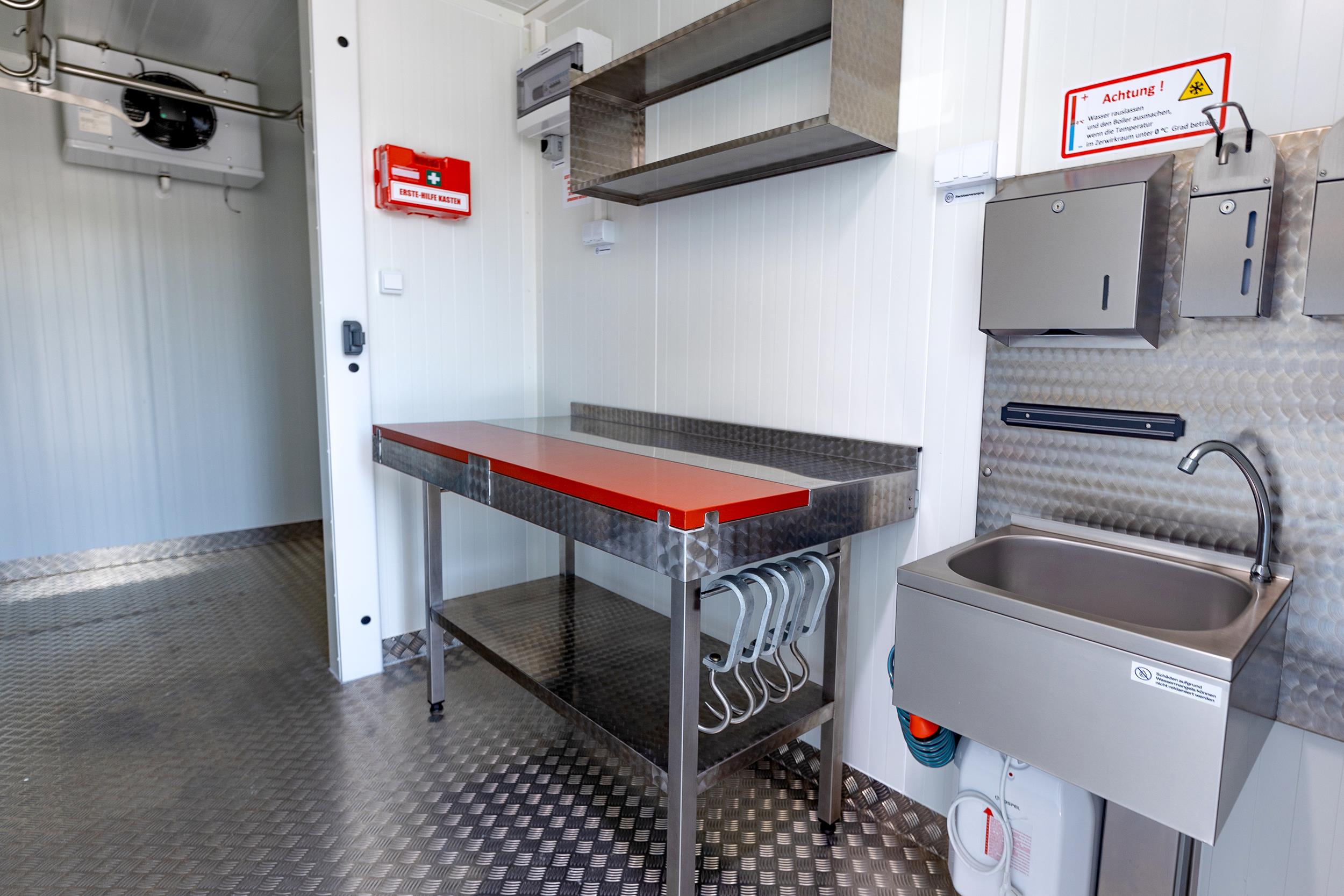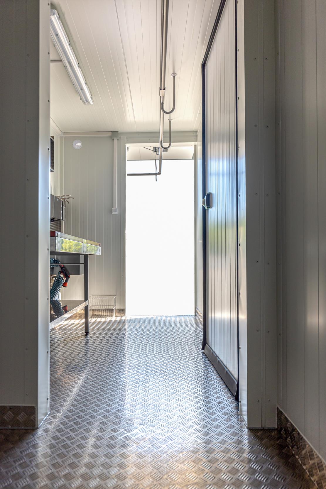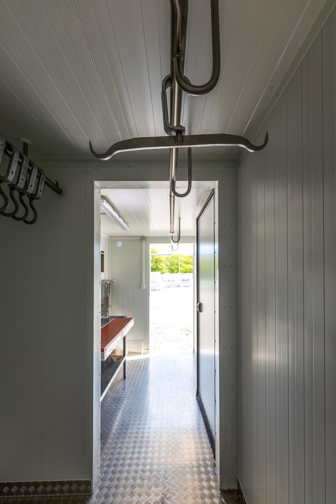 Many of our customers prefer larger containers than those offered in our 4-metre models. The ideal choice for this is the 5×2 processing container. This 5×2 unit features a processing room measuring 270 x 180 cm and a 200 x 180 cm cooling room.