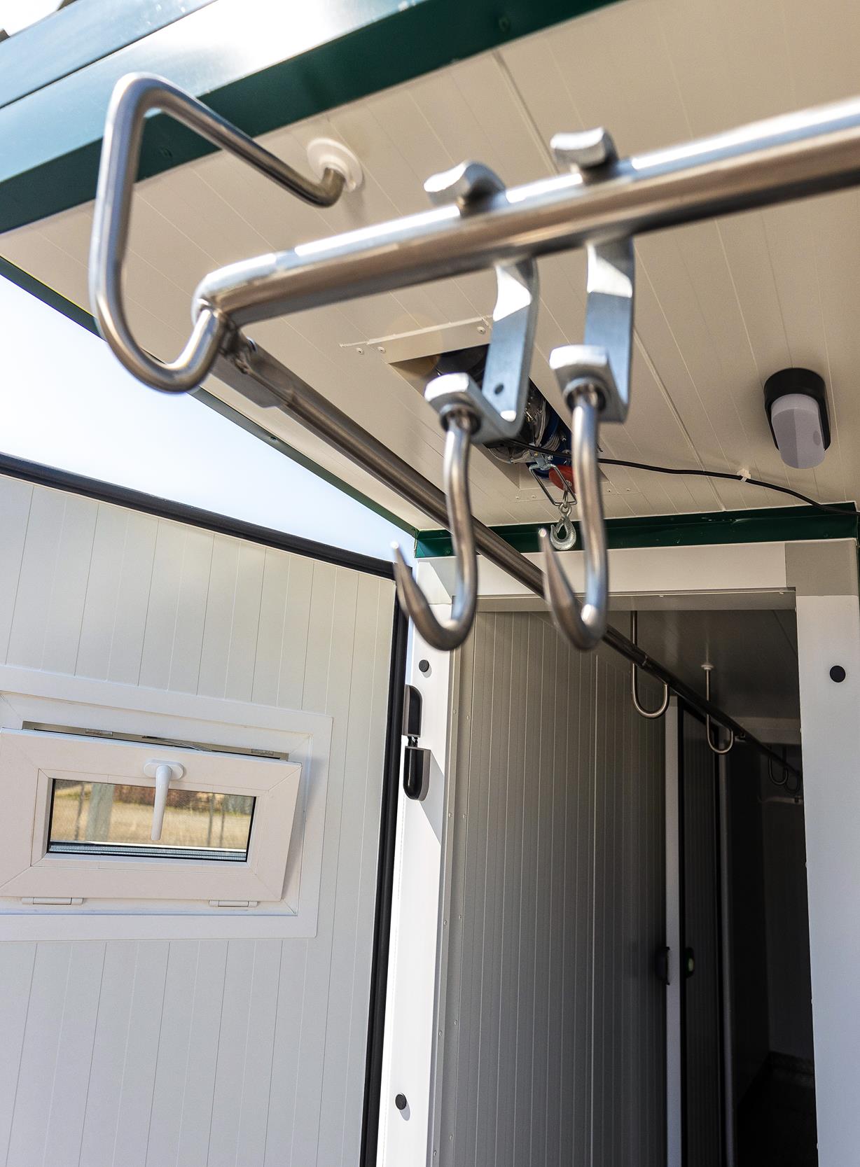 - Double roof – additional roof made of corrugated sheet metal.Stainless steel rail system for hanging hooks.