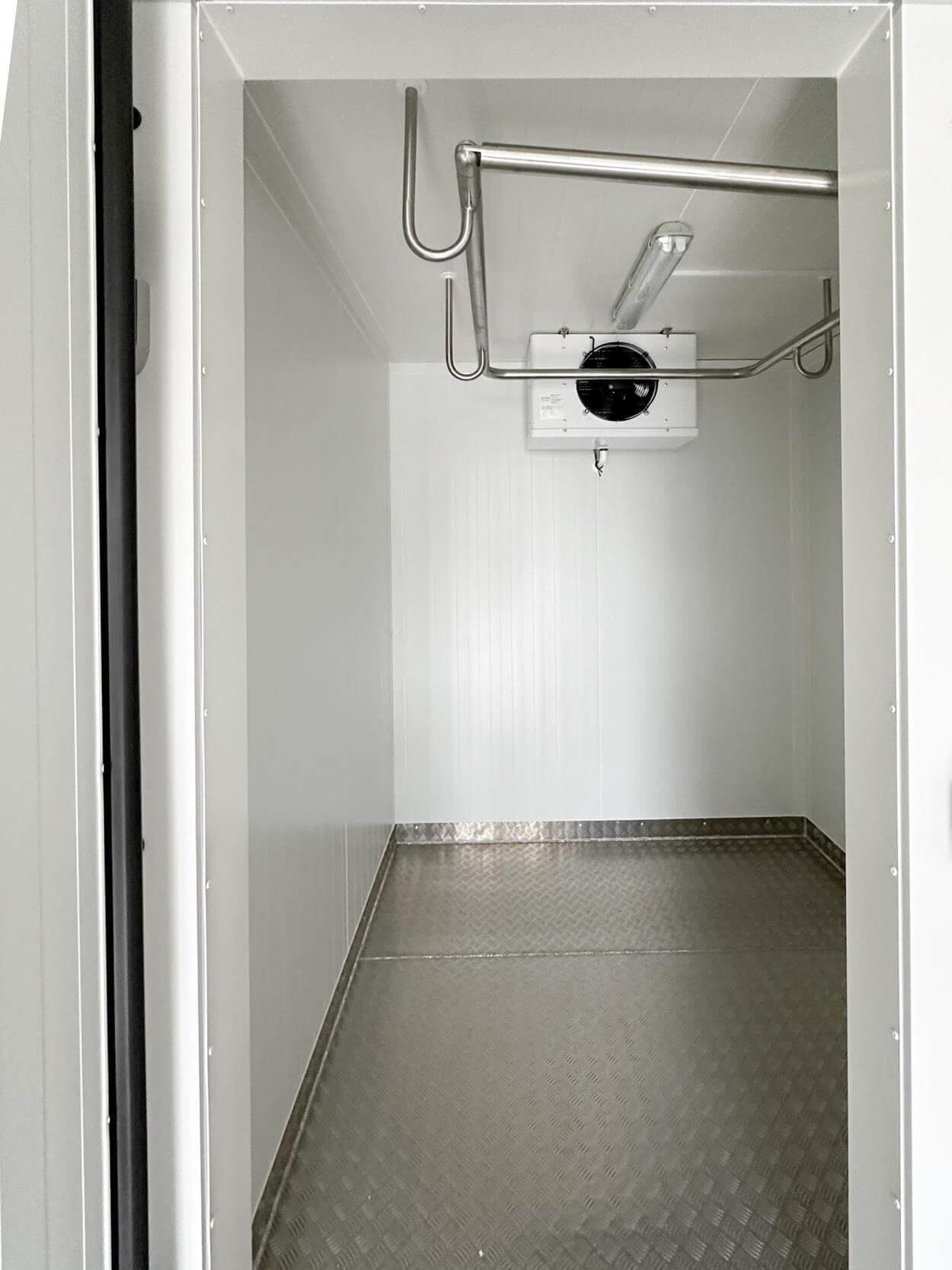 This unit with a cooling unit is 20 cm wider than the 5×2 model. In the 5×2.2 unit, the external width is 220 cm, and the internal width is 200 cm. It consists of 100 mm-thick layered panels made of polyurethane foam, covered with a metal layer on both sides.