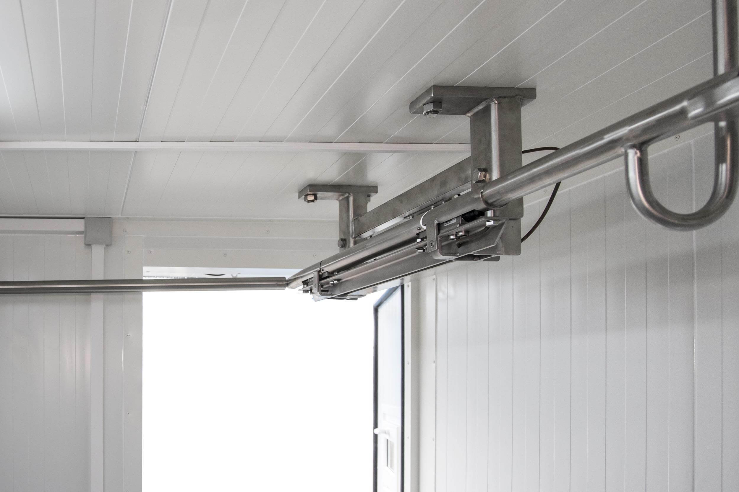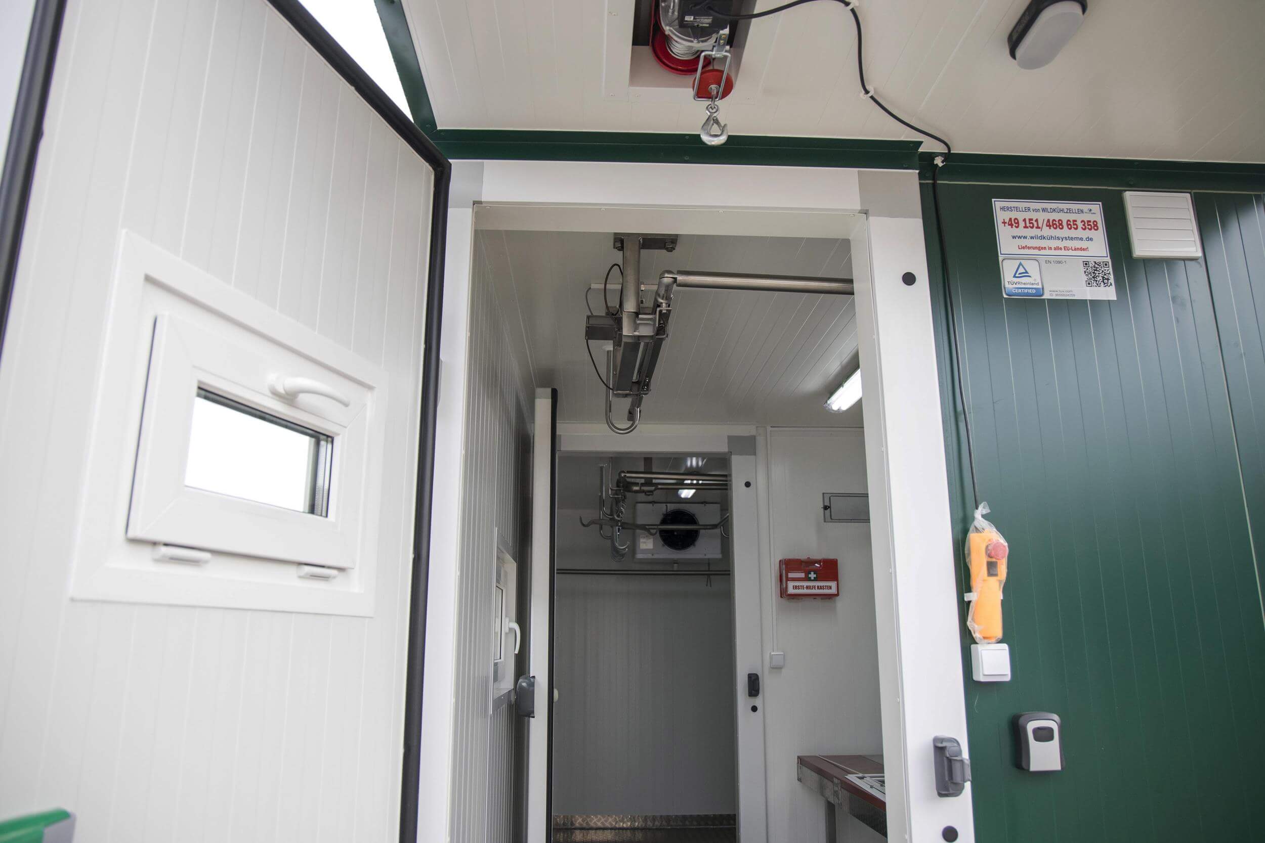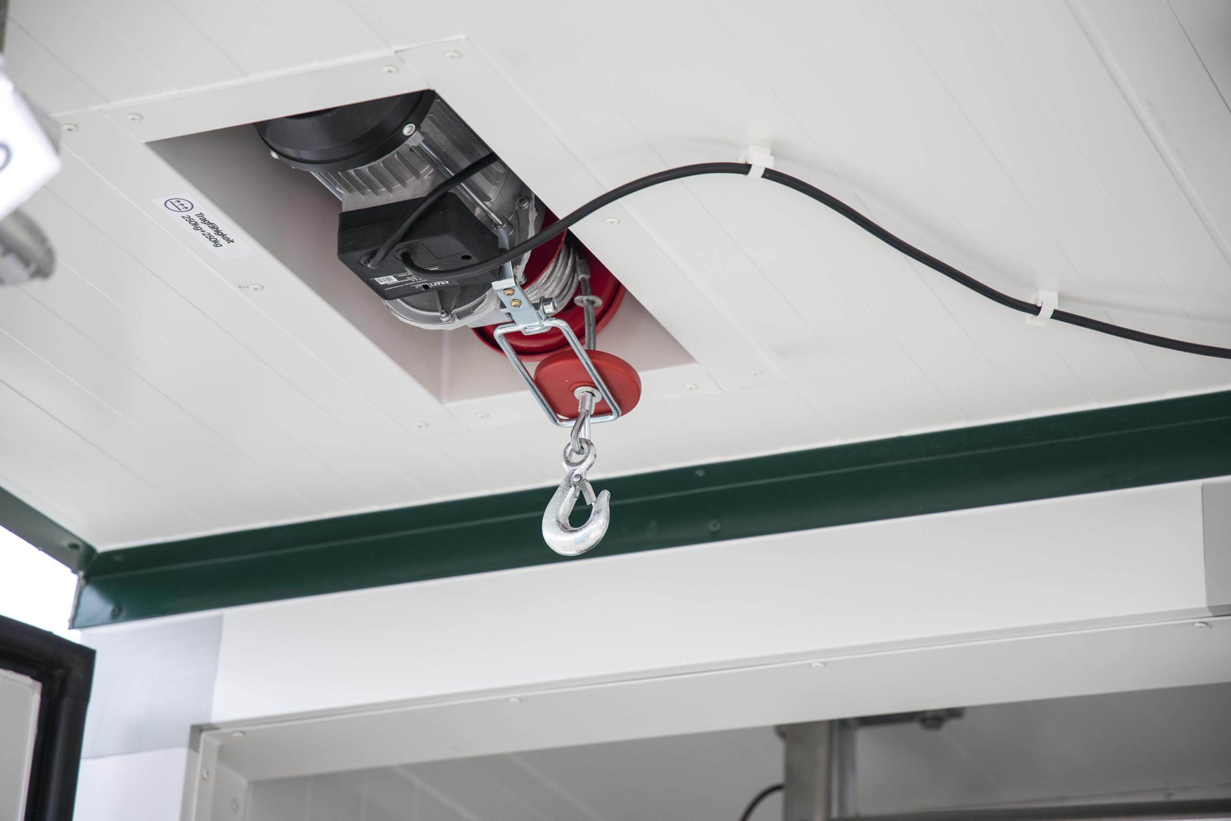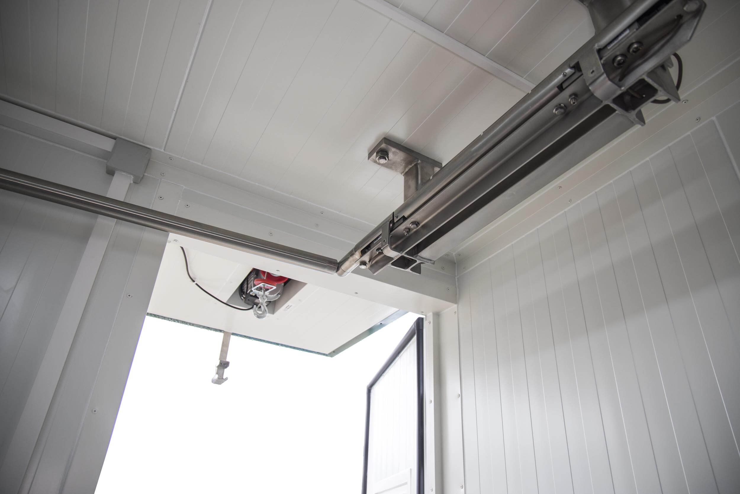 Electric hoist with a lifting capacity of 300/600 kg above the cooling container entrance