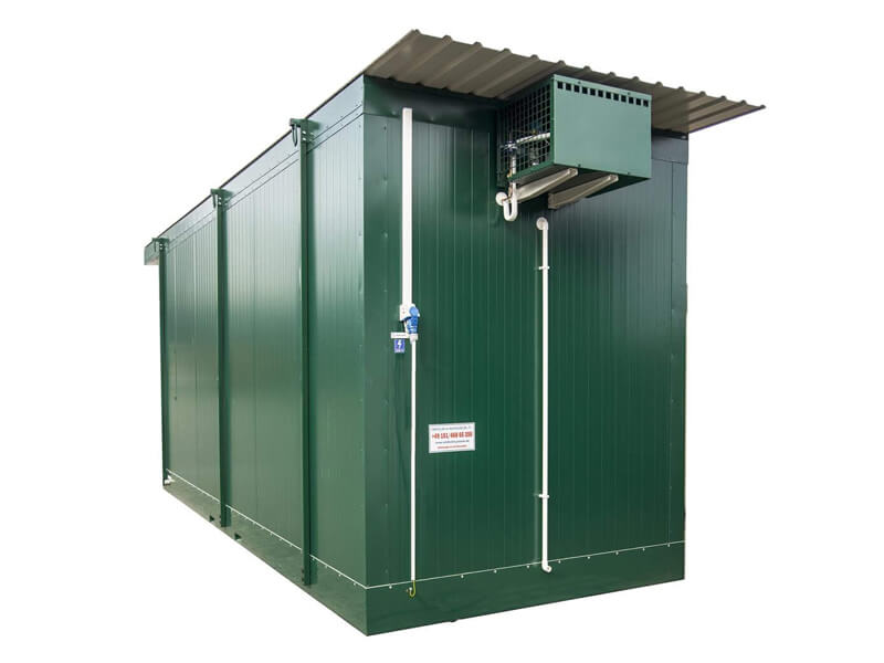 Our containers are made from 100 mm-thick polyurethane foam layered panels, covered on both sides with a metal sheet (new XPS technology, no corrosion, long-lasting, easy to clean, easy to move, no visible installation, no silicone, superb isolation).